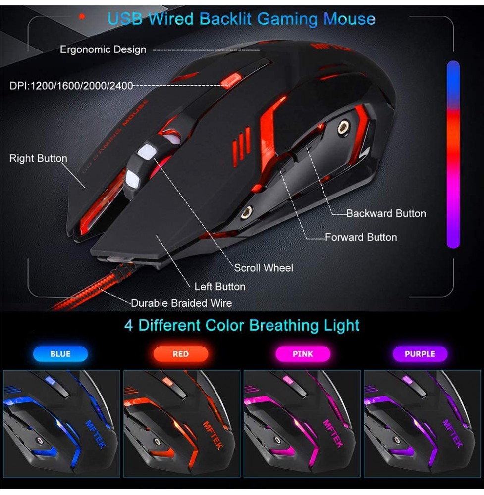 MFTEK RGB Rainbow Backlit Gaming Keyboard and Mouse Combo, LED PC Gaming Headset with Microphone, Large Mouse Pad, Small Compact 87 Keys USB Wired Mechanical Feeling Keyboard for Computer Gamer Office